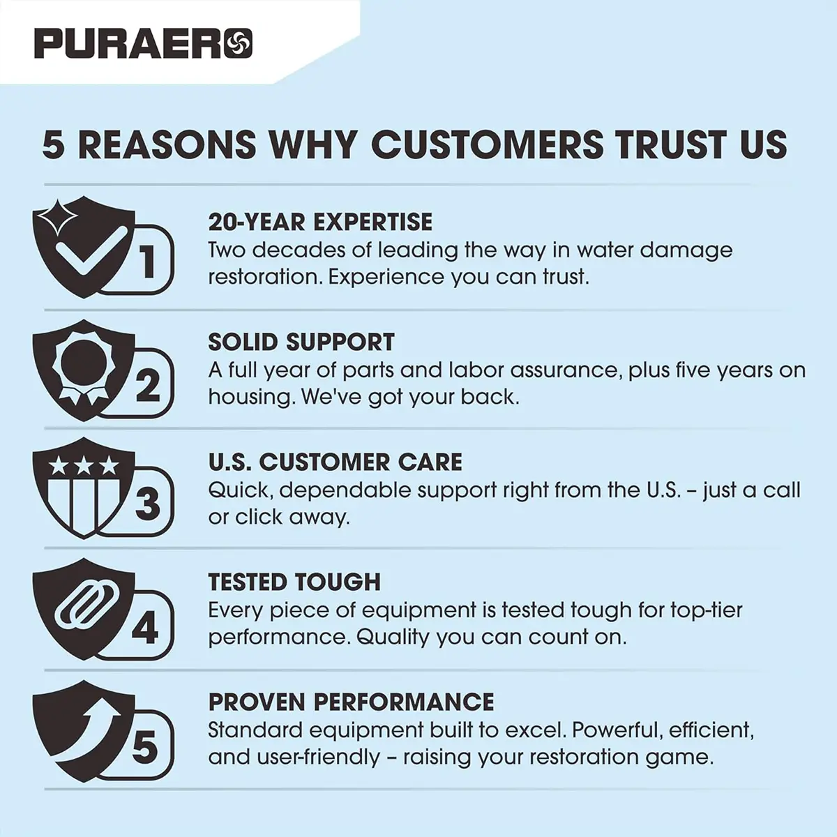 PURAERO 1/3 HP Air Movers are centrifugal blowers that are rugged and efficient, featuring three-speed operation at a low amp draw.