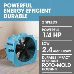 The PURAERO Pro Axial Fan is an impressive high-velocity fan equipped with a ¼ HP motor that operates at an efficient 2.7-amp draw, while producing 4,000 CFM of airflow at the highest setting.