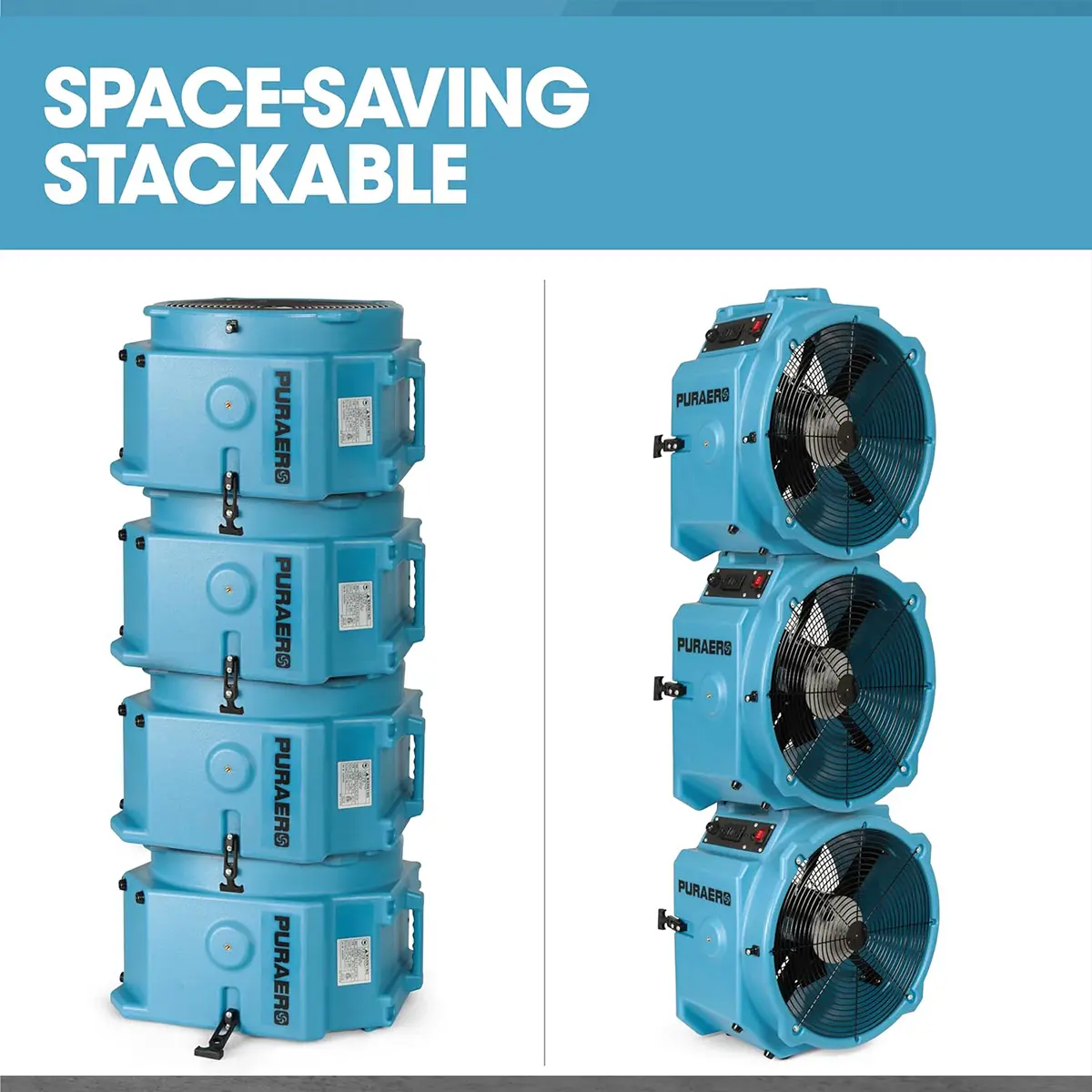 Each Pro axial fan has an easy-grip handle and weighs about 28 pounds. Constructed of heavy-duty rotomolded plastic, these fans can be stacked on top of each other for transporting and storing. They also feature an interlocking design using the attached straps that fasten the units together to prevent shifting.