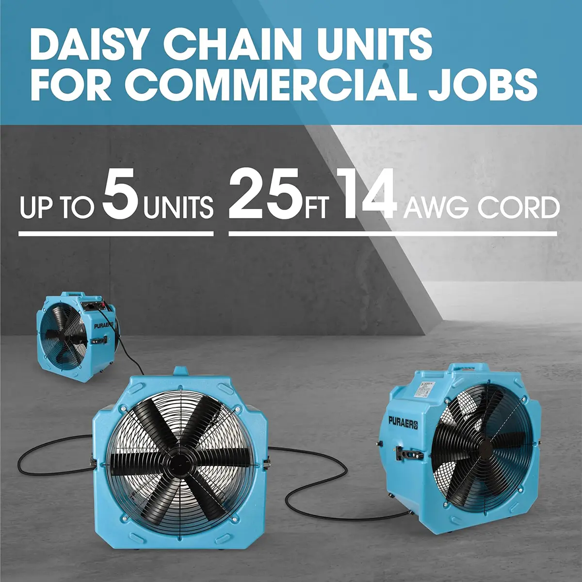 The Pureaero PA-250-AF axial fan features onboard GFCI outlets so that multiple units can be daisy-chained together for very large areas. With a 25-foot power cord, placing these fans on-site is simple and more convenient.