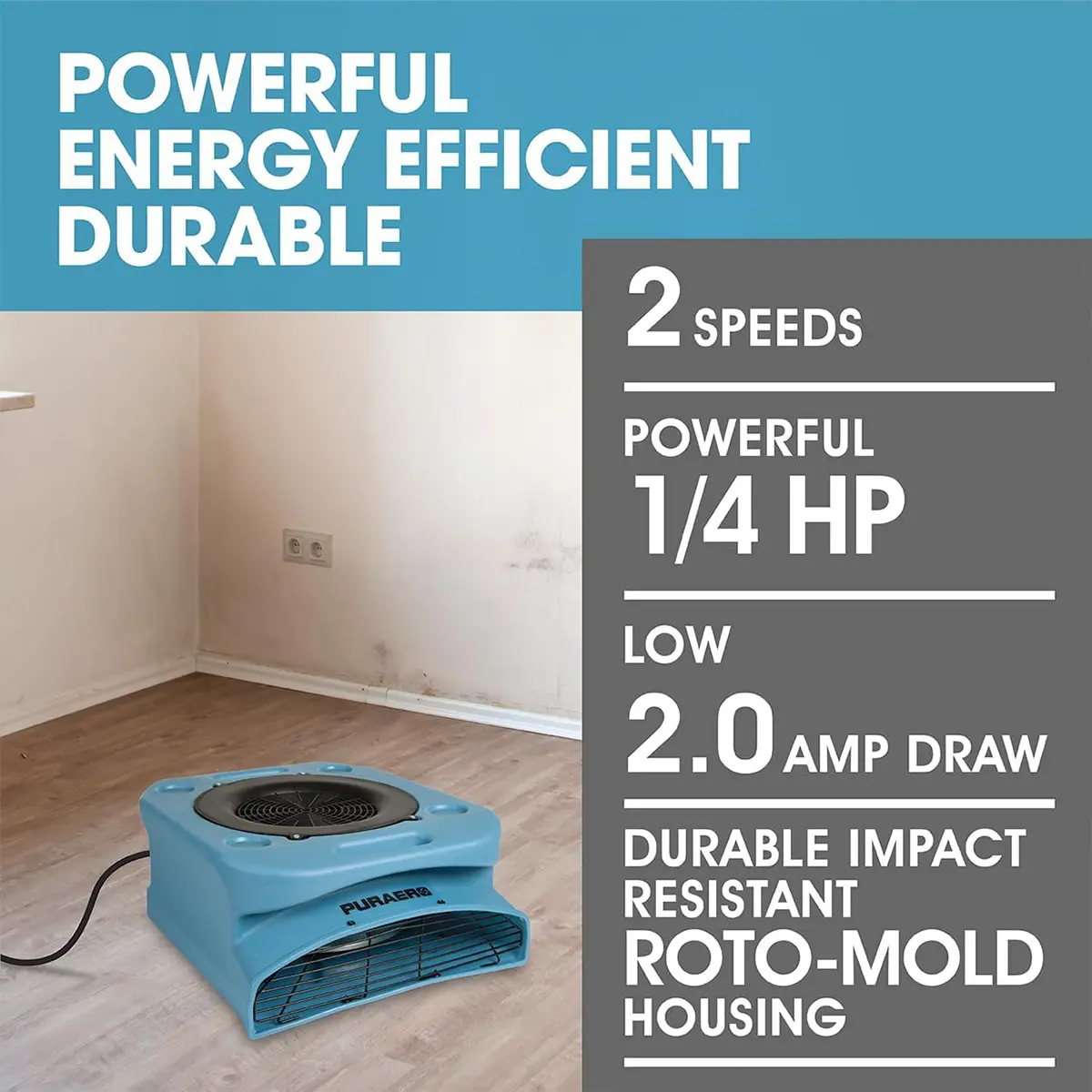 The PURAERO PA-250-LP Low Profile Air Mover is the ideal tool for directing powerful airflow toward flooring, carpets, underneath cabinets and other tight spaces for quick drying of water-damaged property.