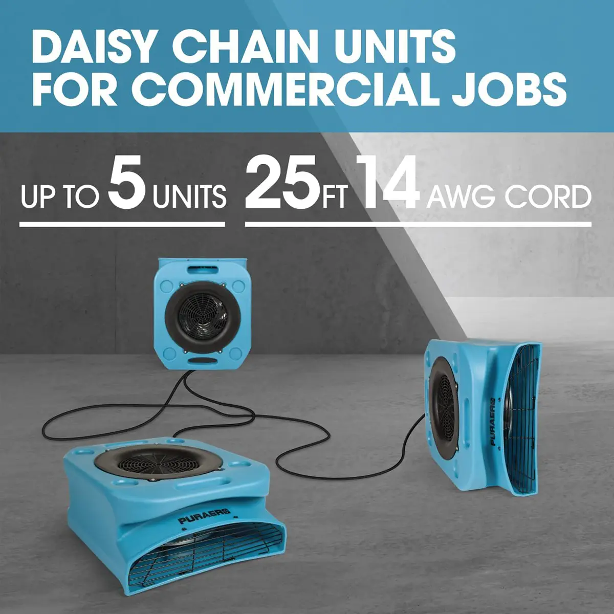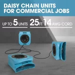 This low-profile air mover is the water damage restoration workhorse with a low, 2.5-amp draw that allows daisy-chaining up to 5 units together. Stand this light-weight fan on its edge to direct airflow in between constricted vertical spaces or in closets, or use in low-ceiling areas like attics, crawl spaces, and basements.
