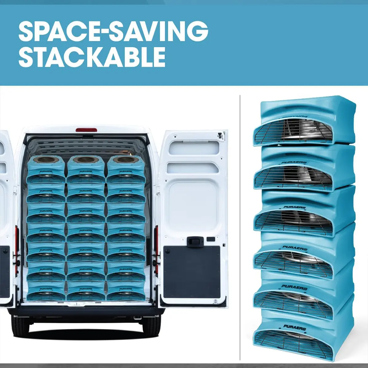 The PURAERO PA-250-LP features an around-body cord wrap for the 25-foot power cord. You can stack up to 6 units high in the horizontal position or stack them on their sides for a more compact fit.